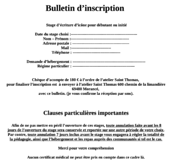 Cours mensuels rentrée 2024Cours mensuels 2025 – 2026 : Cours mensuel de peinture d’icônes : un vendredi par mois 9h-16h30 Possibilité de venir … En savoir plus
