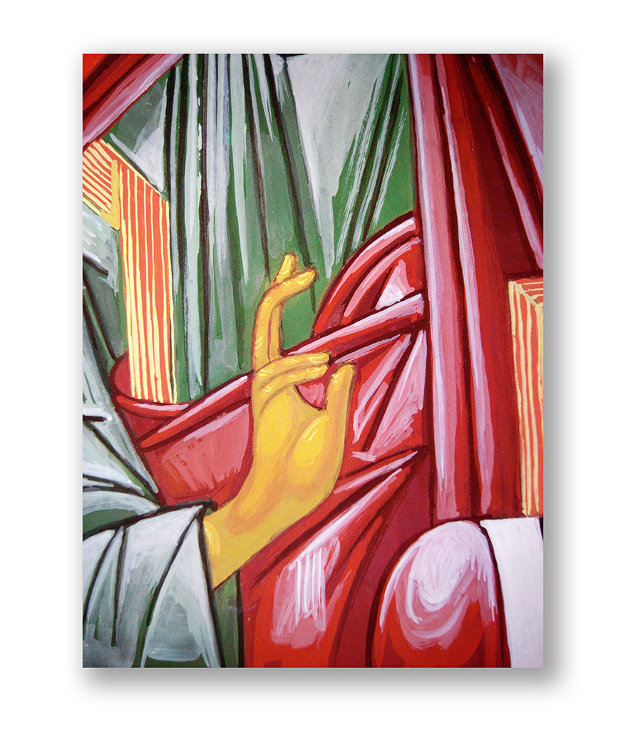 Ce détail de la main bénissante permet de se rendre compte de plusieurs choses, tout d’abord la minutie du détail, des traits de graphismes en pleins et déliés. Les montée des lumières sur les vêtements sont visibles, à savoir que dans l’écriture d’icônes, nous partons du foncé, des ténèbres, du sankir ou du proplasme et nous montons en lumière. La montée en lumière se fait par quatre étapes successives, en partant d’une couleur chaude pour aller vers une couleur froide (du blanc refroidit par un bleu par exemple).